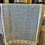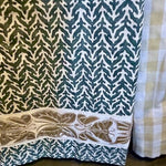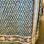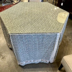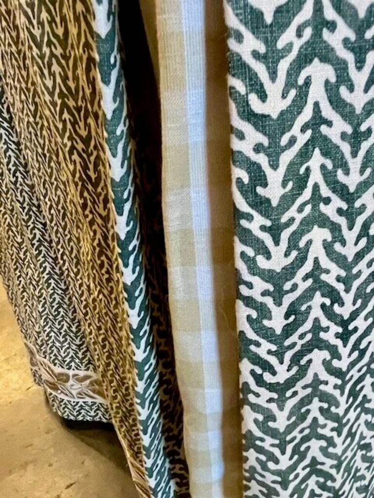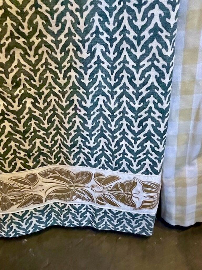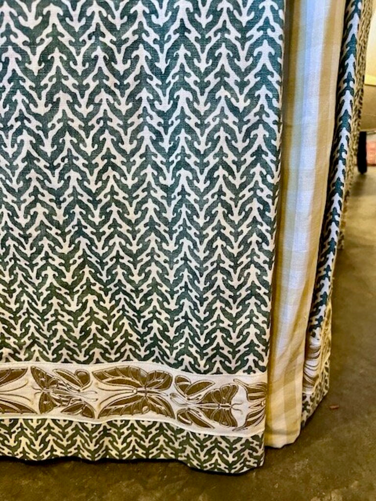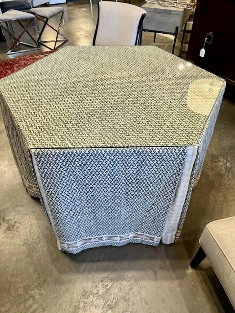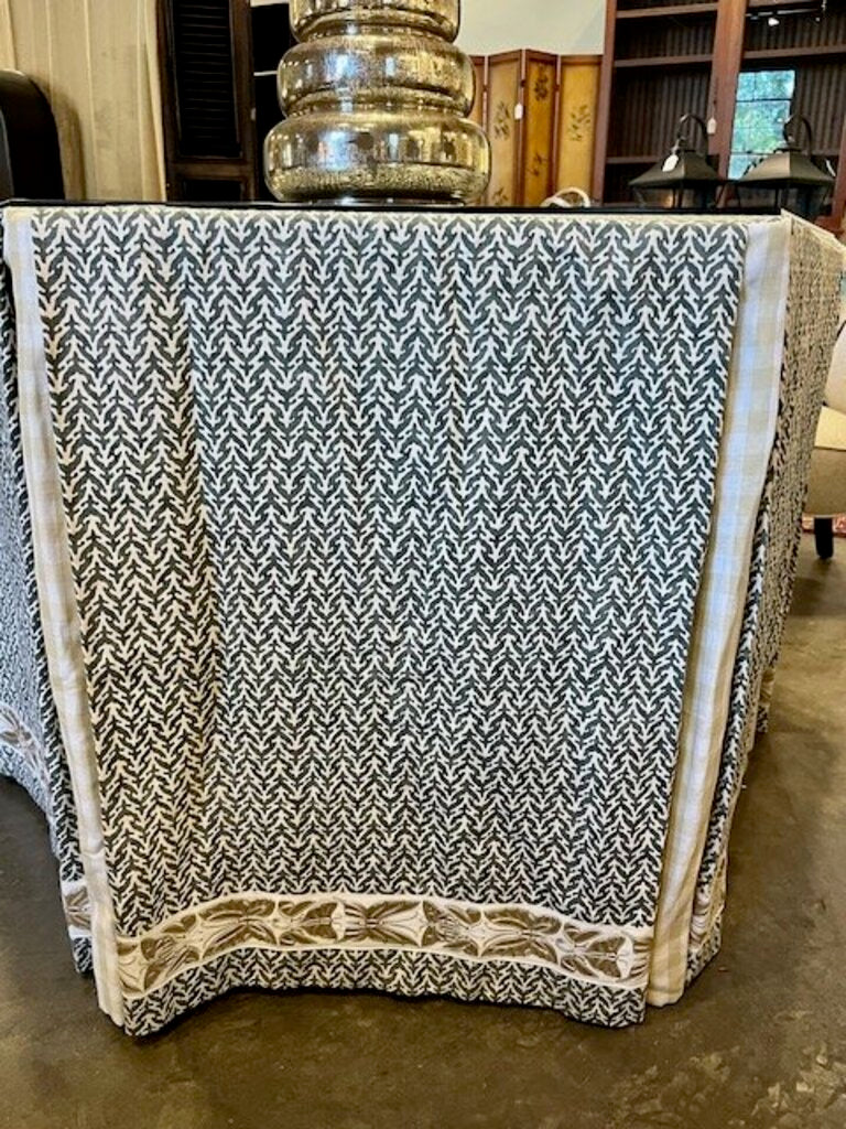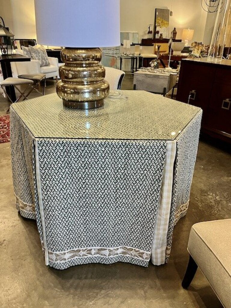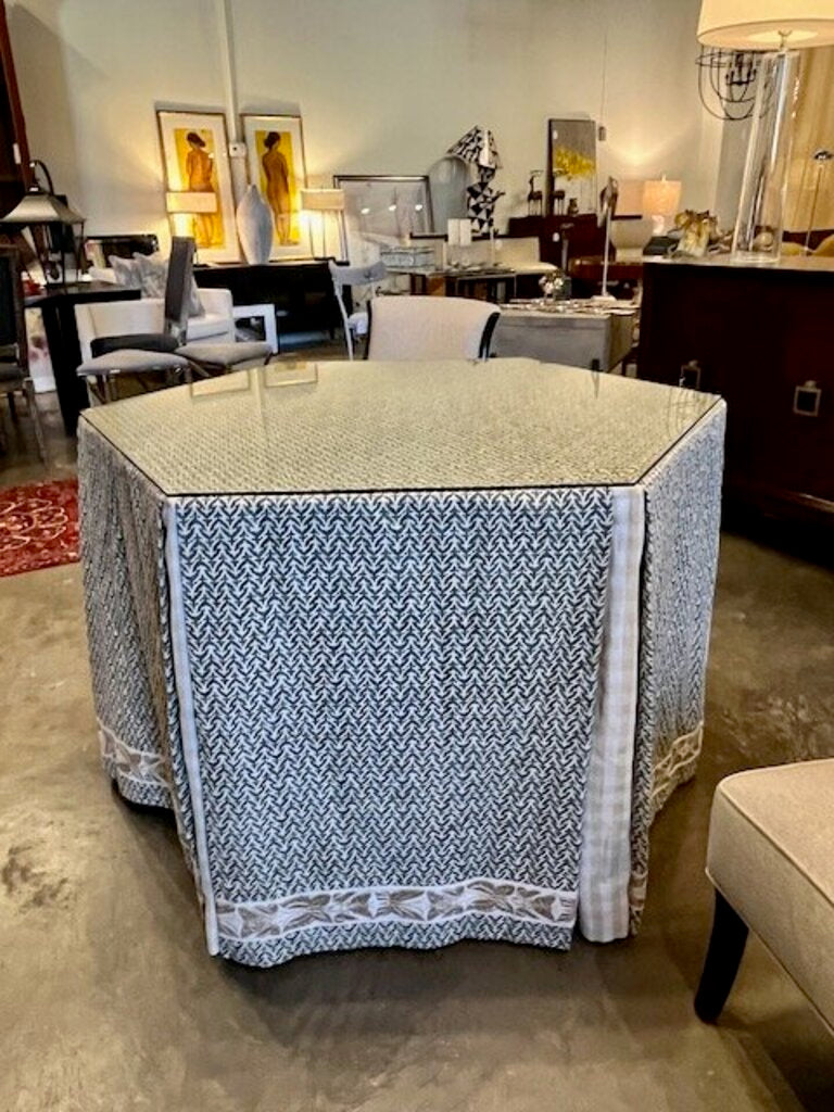 Custom Skirted Table w/ Glass Top 46"Diam x 31"T (Fabrics: Namasay, Chelsea Textiles and Schumacher Trim)